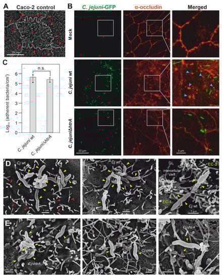 To generate accurately polarized Caco-2 monolayers for our studies, it was necessary to let the cells differentiate for at least 14 days. During culturing, the functionality of the tight junctions was monitored every two days by phase contrast microscopy and by measuring the transepithelial electrical resistance (TER) in a transwell system. The overall TER values increased during this period until reaching maximal values between 350 and 400 Ohm × cm2, as described earlier []. In parallel, the cells were grown under identical conditions on glass slides placed in 12-well plates followed by analysis through scanning electron microscopy (SEM). The SEM technique identified the presence of characteristic cell-to-cell junctions and microvilli as apical markers (Figure 1A). The microvilli are the white-colored structures at the cell surface, which were enriched near the tight junctions (Figure 1A, red arrowheads, also exemplarily marked in image one of panel D). We then infected the Caco-2 cells with GFP-expressing C. jejuni wt and an available ∆htrA knockout mutant for 6 h, and investigated the bacteria bound apically to the Caco-2 cell surface by fluorescence microscopy (Figure 1B, green). The results show that the bacteria bound readily to the apical surface. Quantification revealed that C. jejuni wt and the ∆htrA mutant attached to the cells with similar numbers (Figure 1C). The cells were counter-stained using α-occludin antibodies to visualize proper tight junctions in the non-infected control cells (Figure 1B, red). In accordance with our former investigations [,], we found that C. jejuni wt infection induced the local disruption of cell-to-cell junctions visible as occludin aggregates formed at the apical cell surface (Figure 1B, blue arrowheads), while this phenotype was widely diminished during infection with the ∆htrA mutant (Figure 1B, bottom). Tight bacterial attachment to the apical surface was then confirmed by SEM, as observed for both wt (Figure 1D) and ∆htrA mutant C. jejuni (Figure 1E). However, signs of apical bacterial invasion into the host cell cytoplasm were not evident. In some cases, surface-bound wt bacteria were found near the cell–cell junctions, which formed local “clefts” between neighboring epithelial cells (Figure 1D, right panel). In contrast, the ∆htrA mutant bound non-specifically to the apical cell surface without obviously affecting the cell-to-cell junctions (Figure 1E, yellow arrowheads).