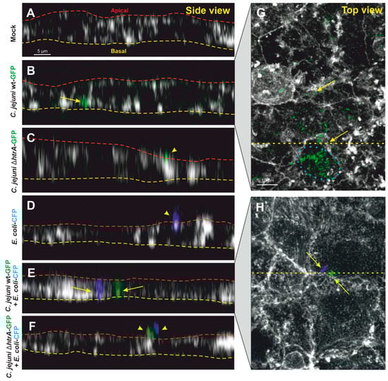 Figure 3. Side and top view of infected Caco-2 monolayers by confocal fluorescence microscopy. The cells were infected with the indicated C. jejuni and/or E. coli bacteria and counterstained with rhodamine-phalloidin to visualize the actin cytoskeleton (gray). Lateral sections (Z-orientation) are given for showing bacterial transmigration to basolateral sides of epithelial cells. Caco-2 monolayers were left uninfected (A) or infected with either C. jejuni-GFP wt (B), C. jejuni ΔhtrA-GFP (C) or E. coli-CFP (D). Dual co-infections were performed using wt C. jejuni-GFP and E. coli-CFP (E) or C. jejuni ΔhtrA-GFP and E. coli-CFP (F). The red and yellow dashed lines mark apical and basal sides of the cell monolayers, respectively. The yellow arrowheads indicate attached bacterial cells, and yellow arrows mark transmigrating bacteria from apical to basal sides. (G,H) Top view of enlarged sections showing the localization of transmigrating bacteria that are between neighboring cells at the basal side (yellow arrows). The images also show some intracellular C. jejuni. Examples are marked with a blue dotted circle. The yellow dashed lines indicate the corresponding cross sections. The cells were infected with an MOI of 1 to detect single bacterial cells.