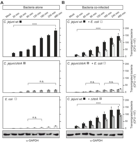 Figure 4. Time course of transmigration properties of C. jejuni and E. coli bacteria across polarized Caco-2 cells using a transwell filter system. Caco-2 cells were cultivated for 14 days to form polarized monolayers on transwell filters and then infected with the indicated single bacterial strains (A) or mixed bacterial strains (B) at an MOI of 25 each. Transmigrated bacteria were collected from the bottom chambers, and C. jejuni were cultivated on Campylobacter agar plates and E. coli on LB agar plates, respectively. Finally, the CFUs were quantified in triplicate. On the bottom are two representative GAPDH blots as loading controls. Significant differences shown in the graphs correspond to p ≤ 0.0001 (****) or non-significant (n.s.).