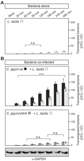 Figure 5. Time course of transmigration properties of C. jejuni and L. lactis bacteria across polarized Caco-2 cells using a transwell filter system. Caco-2 cells were cultivated for 14 days to form polarized monolayers on transwell filters and then infected with the indicated single L. lactis strain (A) or mixed bacterial strains (B) at an MOI of 25 each. Transmigrated bacteria were collected from the bottom chambers. C. jejuni were grown on Campylobacter agar plates and L. lactis on MRS agar plates. Finally, the CFUs were quantified in triplicate. On the bottom is a representative GAPDH blot as a loading control. Significant differences shown in the graphs correspond to p ≤ 0.0001 (****) or non-significant (n.s.).