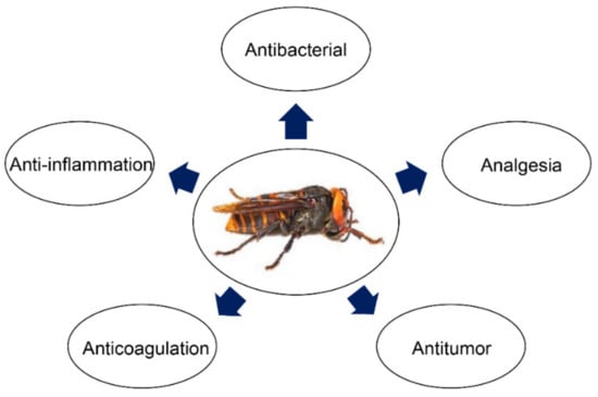 The prevention and treatment effects of wasp venom on the rhinitis, rhinoconjunctivitis, rheumatoid arthritis, ischemia stroke, Alzheimer’s disease, Parkinson’s disease, and epilepsy have been gradually improving [6,7,8,9,10,11]. Other potential therapeutic activities such as anticancer activities are also being investigated [12]. Therefore, wasp venom is an essential reservoir of pharmacologically active molecules [13]. However, to date, some of the constituents of wasp venom remain unexplored. This review summarizes the representative bioactive peptides and proteins identified from vespid venom.