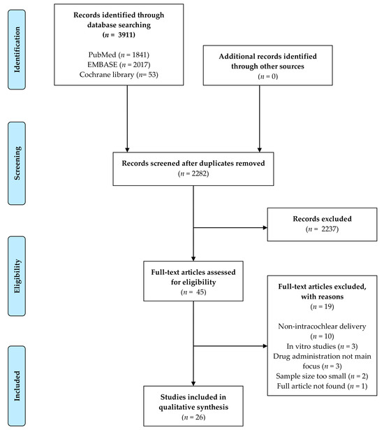The entire inclusion process was carried out by two reviewers independently (QAP & PVB) with the use of Rayyan software for systematic reviews [12]. The following inclusion criteria were applied: (1) prospective study design with a matching control group (n ≥ 5 per group); (2) involving a mechanical insult to the cochlea; (3) where therapy is directly delivered into the inner ear; (4) with a clear description of outcome measures. Both animal and human studies were considered. Non-English articles, in vitro studies, drug dilution studies, review articles, and articles published before 2000 were excluded. Subgroups within included studies not fitting the inclusion criteria were not covered in this review.