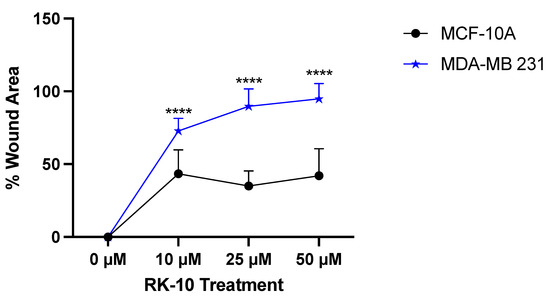Figure 5. RK-10 attenuates wound healing. MCF-10A and MDA-MB 231 cells were treated with RK-10 and migration was measured using the wound healing assay. The wound distance was measured after 24 h and the graph represents the percentage of the wound area. Student’s t-tests were performed and treatments were compared to the DMSO control. Results are expressed as the means ± SDs (**** p < 0.0001), and data are representative, from one of at least three independent experiments.