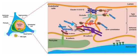 TJs prevent paracellular diffusion and act as a physical barrier to regulate the movement of ions and other molecules between the peripheral blood flow and brain parenchyma. This complex consists of a set of several proteins, the most relevant being the transmembrane proteins (claudin, occludin, and junctional adhesion protein), which, although function independently of each other, work in unison to the effect of joining the plasma membranes of adjacent ECs to seal the paracellular space between them [10]. At the intracellular level, scaffolding proteins zona occludin-1 (ZO-1), ZO-2, and ZO-3 establish a link between the abovementioned transmembrane proteins and the actin cytoskeleton [11,12]. In addition, proteins are also associated with zonula adherens that form the adherens junctions formed by proteins such as the platelet-endothelial cell adhesion molecule (PECAM) and vascular endothelial-cadherin, also called cadherin-5. Forming a zipper-like structure, it regulates intercellular spaces and maintains BBB integrity [13].