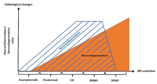 Two main pathological hallmarks are related to MS: early-stage chronic neuroinflammation, and neurodegeneration in the later stages and in particular subtypes of the disease, such as SPMS. Inflammation at the CNS level, also known as neuroinflammation, includes both positive and negative elements for the brain and spinal cord. Among the beneficial aspects, we mention immune surveillance, neuroinflammatory signaling by cytokines such as interleukin-1 (IL-1) and interleukin-4 (IL-4) that help memory and learning, remodeling by inflammation through the M2 microglia and, finally, eustress and “good inflammation” [85]. Another disorder, osmotic demyelinating syndrome, may offer relevant data related to the abovementioned concepts, as ionic rebalancing is the treatment approach for BBB disruption encountered within this syndrome, raising questions as to whether neuroinflammation has a real beneficial impact on pathological CNS conditions.