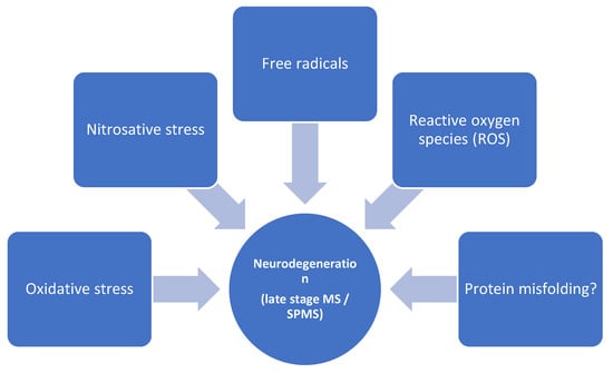 Although encountered in smaller proportions in earlier stages of MS (including clinically isolated syndromes), neurodegeneration gains importance as the disease progresses, characterizing mainly the secondary-progressive form of MS (SPMS). The continuous advancement of disability in the absence of relapses is caused by slow but steady dendrite, axonal, and finally neuronal loss [158]. Though inflammation is considered to be the main factor responsible for cortical degeneration during the early stages of the disease [159], in the advanced stages, other complementary mechanisms come into action. Similar to other neurodegenerative diseases (AD, PD), the impact of oxidative stress, as well as the pathological production of free radicals and ROS, are relevant steps in sustaining neuronal loss (Figure 3).
