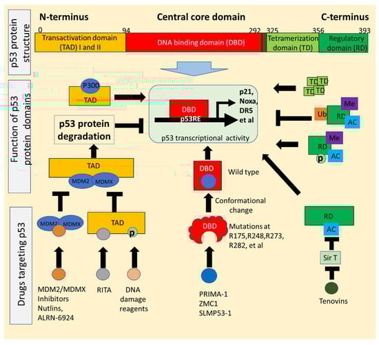Wild-type p53 consists of a p53 transactivation domain at its N-terminal region and a tetramerization domain at its C-terminal region (Figure 1). The N- and C-terminals flank the DNA binding domain, also called the core domain [].