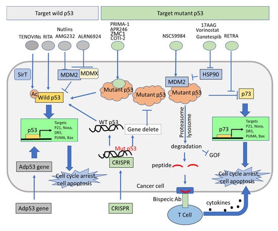 Strategies for targeting mutant p53 and wild-type p53 in cancer cells. Pharmacological approaches for targeting wild-type and mutant p53 in cancer cells are focused on small molecules (upper panel). Small molecules targeting wild-type p53 activation via binding to p53 (such as RITA), inhibition of MDM2/X (such as an MDM2 inhibitor nutlin-3 and the dual inhibitor ALRN6924), post-translational modifications (such as tenovin). Small molecules target mutant p53 via restoration of p53 function (such as PRIMA-1), degradation of mutant p53 via activation of MDM2 (such as 17AAG and NSC59984) or interruption of mutant p53-p73 interaction (such as RETRA). Activation of p73 upregulates p53 target gene expression and induces cell death. Biotherapeutic approaches are based on gene transfection and genomic modifications (bottom panel). p53 is transfected into cancer cells with an adenovirus to replace mutant p53, and upregulates p53 signaling (such as rADp53). Genomic editing is used to restore wild-type p53 or delete mutant p53 in cancer cells by genome editing approaches (such as CRISPR). A bispecific antibody with mutant p53-specific peptide and ALH ligands promotes T cells to recognize and kill p53-mutant tumor cells in cancer immunotherapy.