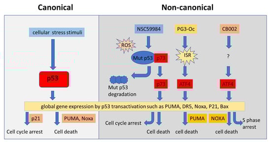 Restoration of p53 pathway signaling in canonical and non-canonical regulatory pathways in cancer cells. Cellular stresses activate p53 pathway signaling through p53 transactivation (canonical pathway, left panel). The p53 pathway signaling is regulated via p73, a p53 family member (such as by NSC59984), or via ATF4 (induction by small molecules such as PG3-Oc and CB002) in mutant p53-expressing cancer cells (non-canonical regulatory pathways, right panel). The gene expression via ATF4 or p73 partially overlaps with the canonical p53 targets, and some of the overlapping canonical p53 pathway signaling target genes (such as Noxa, PUMA, and p21) are crucial for the compounds to induce cell death and cell cycle arrest under different cellular conditions.