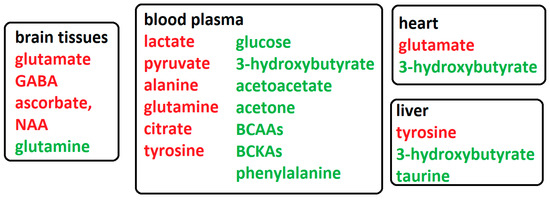 Schematic representation of the main metabolomic changes after cerebral ischemia in rodent models in brain tissues, blood plasma, and remote organs, as detected by 1H NMR (12,29,33,34,37); red—decreased levels; green—increased levels.