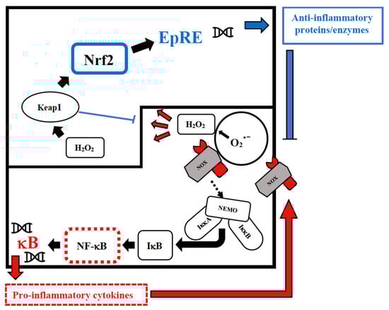 Intranuclear signal transductions can occur in two different pathways: while nuclear factor kappaB (NF-κB) tends to enhance and perpetuate the inflammatory response by triggering the expression of pro-inflammatory cytokines, nuclear factor erythroid 2–related factor 2 (Nrf2) activation through Kelch-like ECH-associated protein-1 (Keap1) oxidation dampens pro-inflammatory signaling by expression of peroxidases and other anti-inflammatory proteins. As E3-ligase, Keap1 also primes inhibitor of NF-κB kinase subunit beta (IKKβ) to degradation via ubiquitination, thereby directly interfering with NF-κB activation. For the sake of clarity, only the reactive oxygen species (ROS)-producing enzyme NADPH oxidase (NOX)-derived H2O2 is shown as an oxidant signal. Depending on the cellular system and the inflammatory stimulus, NOX-derived H2O2 may be supported or replaced by mitochondrial H2O2, lipoxygenase products, and S-alkylating electrophiles derived therefrom. NEMO, NF-κB essential modulator; IκB, Inhibitor of NF-κB.