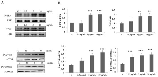 The effect of decapeptide DI-10 on cell survival and protein synthesis pathways was examined. Phosphorylation of ERK, Akt, mTOR, and FOXO3a proteins were quantified using Western blot analysis. The dose-dependent activation of ERK, Akt, mTOR, and FOXO3a was observed in myoblast cells after DI-10 treatment (Figure 2). Low-dose (2.5 μg/mL) DI-10 treatment does not significantly increase the phosphorylation of ERK, Akt, and mTOR. However, 5 and 10 μg/mL of DI-10 significantly increase the phosphorylation of ERK, Akt, mTOR, and FOXO3a proteins, suggesting that DI-10 peptides have an effect in regulating protein synthesis in muscle cells.