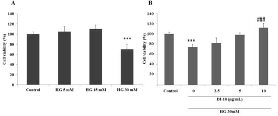 DI-10 improves the viability of C2C12 myoblast cells under high glucose stress. (A) C2C12 cells were treated with different concentrations of D-glucose (5, 15, and 30 mM) and the cell viability was determined with MTT assay. (B) C2C12 cells were treated with 30 mM HG followed by different concentrations of DI-10. *** p < 0.001 compared to control groups and ### p < 0.001 compared to the high glucose.