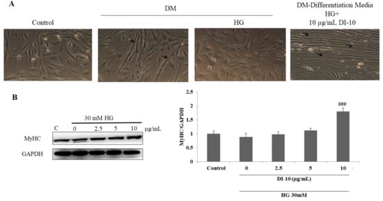 The effect of the decapeptide DI-10 on myogenic differentiation under hyperglycemic conditions was determined by a microscopic observation of cell morphology and MyHC expression (Figure 4). DI-10 treatment at 10 μg/mL induces structural changes in C2C12 cells from flat-spindle shape to long myotubes with thick spindle shape. Further, DI-10 significantly increased the expression of MyHC protein, suggesting myoblast differentiation efficacy of DI-10.