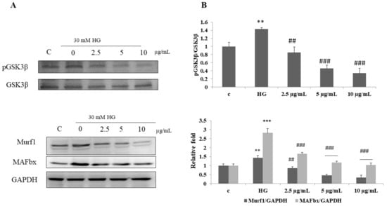 Ubiqueligase E3, such as atrogin-1(MAFbx) and muscle ring-free finger-1 (Murf-1), is known to contribute toward the breakdown of proteins which was regulated by GSK-3β. So, we evaluated the effect of DI-10 on the protein involved in muscle atrophy (Figure 6). In C2C12 myoblast cells under hyperglycemic conditions, the expression of pGSK3β, MAFbx and MuRF1 was found to be increased significantly. DI-10 significantly decreased the expression of pGSK3β, MAFbx and MuRF1 under high-glucose conditions in a dose-dependent manner.