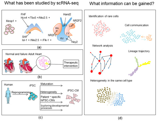 Figure 1. Topics commonly studied by scRNA-seq in the mammalian heart. (a) Embryonic heart development: the role of cardiac progenitor cells during in vivo cardiogenesis and critical transcription factors determining cardiac cell fates [12,14,17,20,21,22,23,24,25]. (b) Adult heart in health and disease: cellular heterogeneity and intercellular crosstalk, the role of specific cell subtypes in cardiac diseases, and potential therapeutic opportunities [8,9,13,15,16,26,27,28,29,30,31,32,33]. (c) Induced pluripotent stem-cell-derived cardiomyocytes: ways of improving modeling (maturation and reprogramming efficiency), patient-specific cells to understand genetic heart diseases, and in vitro modeling of embryonic heart development [18,34,35,36,37,38,39,40,41,42,43,44,45,46,47,48,49,50,51]. (d) ScRNA-seq can be used to explore cellular heterogeneity, identify rare cell types, deduce intercellular communications, establish regulatory networks, and construct lineage trajectories.