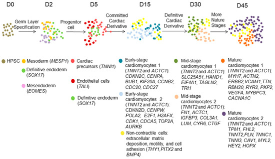 Figure 2. Cellular heterogeneity and gene expression during cardiac differentiation from hiPSC-CMs defined by single-cell transcriptomic profiling. On day 2, the differentiating population comprises cells corresponding to the mesoderm (MESP1), definitive endoderm (SOX17), and mesendoderm (EOMES). By day 5, cardiac precursors (TNNI1) and endothelial cells (TALI), and a persistent cluster of definitive endoderm are defined. On day 15 of cardiac differentiation, the population comprises 3 clusters, two expressing TNNT2, ACTC1, and cell cycle genes, representing early stage proliferative CMs; and a cluster of non-cardiomyocytes expressing genes enriched in processes, such as extracellular matrix deposition, motility, and cell adhesion (THY1, PITX2, and BMP4). The population on day 30 is composed of 2 clusters of mid-stage cardiomyocytes and a cluster of non-cardiomyocytes. By day 45, 2 mature CM clusters expressed sarcomeric (MYH6, MYL2, TNNT2, and MYBPC3) and calcium handling genes (RYR2, PLN). It is worth noting that the ventricular subsets marked by MYL2 only appeared at the later stage of differentiation (D30–D90), in contrast to the atrial subsets (MYL7) that appeared earlier. This illustration is a schematic representation of scRNA-seq studies on hiPSC-CM differentiation by Churko et al. [40] and Friedman et al. [18].