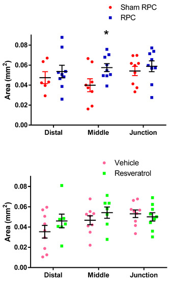 In the sham cuff-treated group, the mean basilar cross-sectional area at the vertebrobasilar junction and mid and distal segments was 0.053 ± 0.014, 0.040 ± 0.017, and 0.047 ± 0.015 mm2, respectively. In the true cuff-treated group, the mean basilar cross-sectional area at the vertebrobasilar junction and mid and distal portion was 0.059 ± 0.016, 0.057 ± 0.011, and 0.053 ± 0.021 mm2, respectively. The cross-sectional area of the mid-basilar artery in the true cuff preconditioning group was significantly larger by 43% (p = 0.03) when compared to the sham preconditioning group. However, the diameter for the proximal and distal basilar segments were not statistically different between these two groups (Figure 2). Representative vessel diameters are shown in Figure 3. No differences in the cross-sectional area were found in the resveratrol-treated group when compared to the vehicle-treated group for any of the three basilar segments (Figure 2).