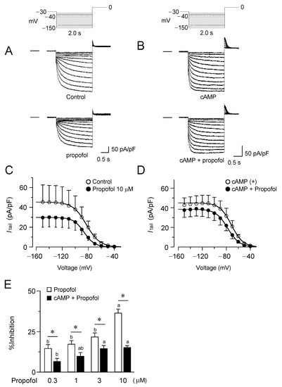 Propofol (2,6-diisopropylphenol) is an intravenous anesthetic drug that is widely used in the induction and maintenance of general anesthesia and sedation because of its advantages, which include a controllable state and fast awakening [1]. The potentiation of GABAA receptor Cl− channels has long been considered a major mechanism for the anesthetic action of propofol [2,3,4]. This drug also modulates the function of several voltage gated ion channels, including hyperpolarization-activated, cyclic nucleotide-gated (HCN) channels [5,6,7], which may also contribute to its principal anesthetic effects. It is also known that propofol infusion can cause several side effects (propofol infusion syndrome) in several organs, including myocardial cells, such as metabolic acidosis, hyperkalaemia, rhabdomyolysis, or signs of heart failure. A dosage reduction or discontinuation is recommended when these conditions developed [8]. On the other hand, propofol provides cardioprotection of cardiomyocyte function under ischemic condition e.g., in animal model of heart failure, propofol was reported to protect against peroxidative and functinal damages induce by exogenous H2O2 [9].