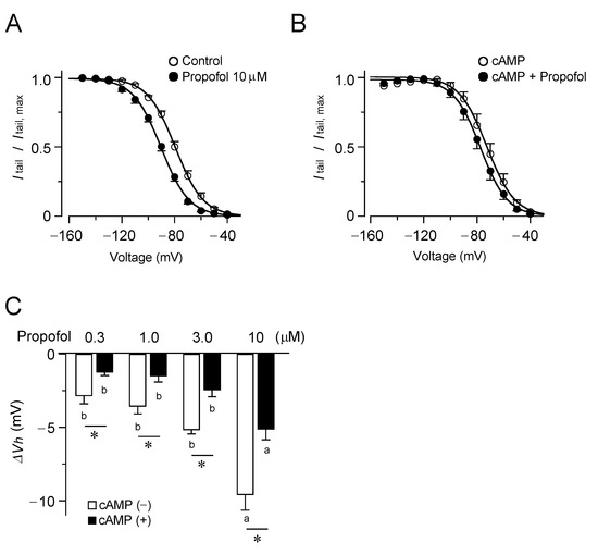To examine the involvement of cAMP-dependent gating in the current inhibition by propofol, we recorded HCN4 currents in the presence of cAMP at a concentration of 50 µM in the pipette (Figure 1B). Measurements were taken >15 min after the start of cAMP loading to achieve the steady state. In agreement with previous reports on the HCN4 channels [29], cAMP caused a depolarizing shift in Vh (see also Figure 2A,B) with a slight but non-significant increase in the maximum current density (Figure 1D). As is evident in Figure 1B, in the presence of cAMP, propofol had sparing effect on the HCN4 currents. The inhibition of the tail current by propofol was significantly attenuated, and this attenuation was similar for all concentrations examined (Figure 1E), suggesting that cAMP influenced the propofol effect in a noncompetitive manner.
