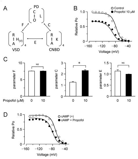 Allosteric gate model simulation of the inhibition of HCN4 channels by propofol. (A) The allosteric gate model for HCN channel activation, where L, H(V), K are the equilibrium constants for the transitions between close and open (C–O) or rest and active (R–A) states in the PD, VSD, and CNBD, respectively. F, C, and E are the allosteric coupling factors between the PD and the VSD, between the PD and CNBD, and between the VSD and CNBD, respectively. (B) Model fitting to the -V data in the presence and absence (control) of propofol, obtained by normalizing the current density (relative ) to the maximum value in control. The best-fit parameters of F, C, and E are 8.2, 1.6, and 1.6, respectively, in controls, and became 7.8, 2.9, and 1.3, respectively, in the presence of propofol. (C) Parameters of model fitting to the -V data in the presence and absence (control) of propofol. Bars represent the mean ± S.E.M. (n = 6). *, p < 0.05, NS, not significant. (D) Simulated -V curves with cAMP (50 μΜ) as determined by the model with the same parameter sets used in (B), which closely overlay the experimental data points.