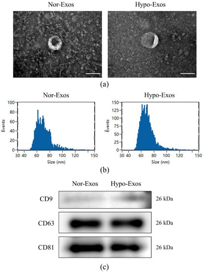 Characterization of Nor-Exos and Hypo-Exos. (a) Morphology of Nor-Exos and Hypo-Exos under TEM. (b) Diameter distribution of Nor-Exos and Hypo-Exos assessed by NanoFCM. (c) Exosomal surface markers CD9, CD63 and CD81 were detected by Western blot analysis. Scale bars: 100 nm (a).