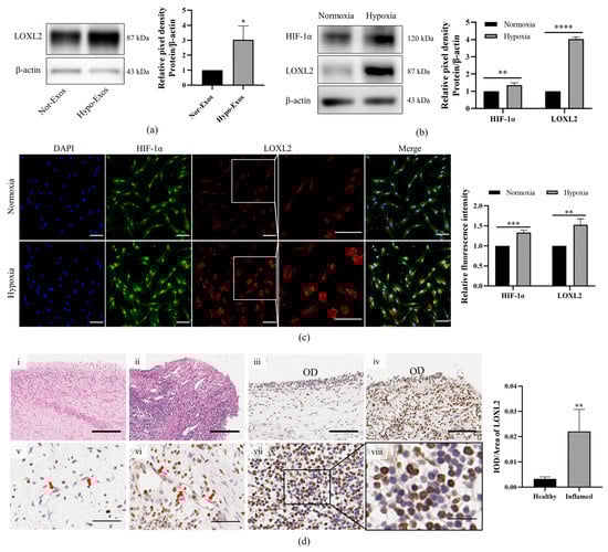 LOXL2 belongs to the lysyl oxidase family, which contributes to collagen and elastin cross-linking in the extracellular matrix by mediating the oxidative deamination of the peptide lysine. LOXL2 is also a regulator of sprouting angiogenesis via collagen IV scaffolding. The previous iTRAQ-based proteomic analysis identified LOXL2 as an upregulated protein in Hypo-Exos. We validated the expression of LOXL2 using Western blot analysis (Figure 7a), which verified that expression patterns were consistent with iTRAQ quantitative proteomics results. As previously reported, LOXL2 was a direct transcriptional target of HIF-1α []. We aimed to detect the protein expression of HIF-1α and LOXL2 in DPSCs under normoxia and hypoxia by Western blot and immunofluorescence staining. The protein levels of HIF-1α and LOXL2 were markedly increased after hypoxia preconditioning for 48 h as detected by Western blot (Figure 7b) and immunofluorescence staining (Figure 7c). Interestingly, LOXL2 showed predominantly nuclear localization under normoxic conditions while hypoxic conditions were mainly associated with cytoplasmic LOXL2 localization, as determined by immunofluorescence assays (Figure 7c). In vivo, inflammation usually produces a hypoxic microenvironment in dental pulp. We further analyzed LOXL2 expression and location in healthy and inflamed dental pulps by immunohistochemical staining. The healthy and inflammatory state of dental pulp was confirmed by hematoxylin-eosin staining. The pulp structure was clear in the healthy pulp but disorganized in inflamed pulp, along with the discontinuous odontoblast layer, dilated blood vessels and inflammatory cells around blood vessels (Figure 7d-i,d-ii). Healthy dental pulps exhibited weak LOXL2 staining only in the odontoblast layer and in vascular endothelial cells (Figure 7d-iii,d-v). Positive staining was also observed in odontoblasts and endothelial cells in inflamed dental pulps (Figure 7d-iv,d-vi). More notably, inflamed pulps demonstrated the infiltration of inflammatory cells with strong LOXL2 immunoreactivity (Figure 7d-vii). In general, the immunostaining intensity of LOXL2 was higher in inflamed dental pulps than in healthy dental pulps (Figure 7). The experiments above revealed that LOXL2 expression was upregulated by a hypoxic microenvironment in vivo and in vitro.