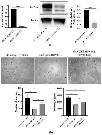 It is known that LOXL2 regulates the angiogenesis of endothelial cells (ECs). LOXL2 knockdown in ECs results in decreased sprouting [] and tube formation in a Matrigel-based angiogenesis assay []. In order to analyze the role of Hypo-Exos and LOXL2 in HUVEC angiogenesis, we silenced LOXL2 in HUVECs and determined whether the addition of Hypo-Exos restored in vitro angiogenesis. Quantitative real-time PCR analysis and Western blot analysis confirmed that LOXL2 mRNA and protein expression levels were significantly decreased in shLOXL2-HUVECs (Figure 8a). Obviously, the silencing of LOXL2 significantly reduced the number of junctions and total tube length in the Matrigel-based tube formation assay (Figure 8b). Moreover, treatment with Hypo-Exos partially rescued the inhibitory influence of LOXL2 silencing on tube formation in HUVECs (Figure 8b). Altogether, these results partially confirmed that LOXL2 may be one of the key molecules in Hypo-Exos-mediated angiogenesis.