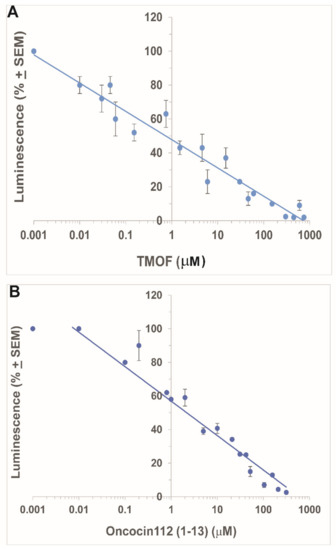 Inhibition of luciferase biosynthesis shown as reduction in luminescence (%) in E. coli S30 extract in the presence of increasing peptide concentrations (0.001-750 μM). (A) AeaTMOF showing IC50 of 1.0 μM, and (B) oncocin112 (1–13) showing an IC50 of 2.0 μM. Each point is the mean of three determinations + SEM (see Section 2.3 for details). Luminescence at 100% indicates no inhibition of luciferase biosynthesis.