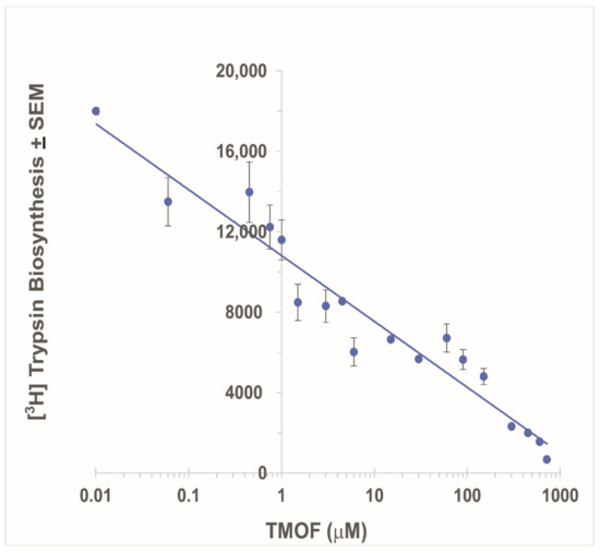 Inhibition of Ae. aegypti late larval [3H]trypsin biosynthesis by increasing concentrations (0.01–750 μM) of AeaTMOF in the S. frugiperda TnT T7 insect cell extract protein expression system, showing an IC50 of 1.8 μM. Each point is a mean of three determinations ± SEM (see Section 2.4 for details).