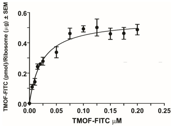 Specific binding of AeaTMOF to E.coli-purified ribosomes expressed as AeaTMOF-FITC (pmo/Ribosome (μg)) showing Michaelis Menten binding kinetics and using nonlinear regression (R2 = 0.84). Binding results were corrected for nonspecific binding by incubating ribosomes without AeaTMOF-FITC or with AeaTMOF-FITC and without ribosomes (see Section 2.7). Each point is an average of six determinations ± SEM. The data represent results of one experiment from two independent experiments with similar results. KD = 23 ± 3.4 nM ± SEM, Bmax = 0.553 ± 0.023 pmol/μg ribosome ± SEM, and Kassoc = 4.3 × 107 M−1.