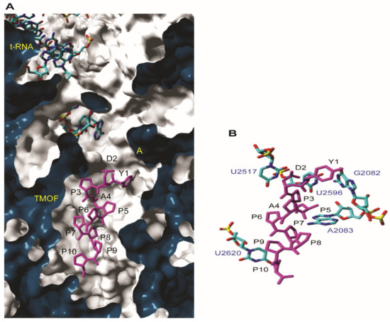 (A) Close-up cut view showing the docking of AeaTMOF (magenta stick) within the peptide exit tunnel of 23S RNA of T. thermophilus ribosome. The 5tRNA and the A-site of the 23S RNA are indicated. (B) Docking of AeaTMOF (magenta stick) into the peptide exit tunnel of 23S RNA of T. thermophilus showing the nucleotide bases (blue sticks) involved in the interaction with the peptide through hydrogen bonds (not shown) and stacking interactions.