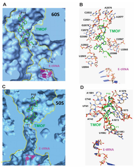 Docking of AeaTMOF to D. melanogaster (60S) and E. coli (50S) ribosomes exhibited the most favorable energy when AeaTMOF occupied the peptide exit tunnel of both the Drosophila (60S) and E. coli (50S) ribosome large subunit (Figure 6A,C), blocking the entrance to the exit tunnel mainly by hydrophobic stacking interactions with the rings from purine and pyrimidine nucleotide bases of the Drosophila (28S) and E.coli (23S) r-RNA. A few hydrogen bonds between AeaTMOF and the nucleotide bases also participate in the interaction of AeaTMOF with the 28S and 23S r-RNAs (Figure 6B,D).