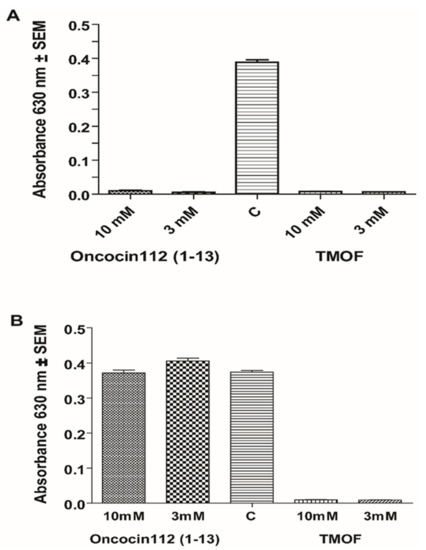 Incubation of E. coli cells with Oncocin112 (1–13) and AeaTMOF at concentrations of 3 and 10 mM (A) with E. coli cells expressing SbmA and (B) with E. coli mutant cells SbmA- expressing the ABC-tmfA importer. Control cells incubated without oncocin112 (1–13) or AeaTMOF (C).