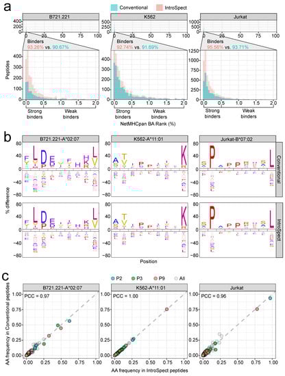 Immunopeptides from IntroSpect and conventional database search are very similar. (a) The histogram of predicted BA rank values of peptides identified by conventional and IntroSpect search: the peptides in separate panels are predicted to be strong or weak binders (BA rank < 2%), with their percentages marked on the panel. (b) The sequence logos of immunopeptides in three datasets (B721.221-A*02:07, K562-A*11:01 and Jurkat-B*07:02) identified by the conventional and IntroSpect search. (c) Amino acid frequencies at each position for peptides identified by the conventional and IntroSpect search.
