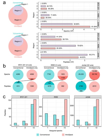 The high consistency of identified spectra and peptides between conventional and IntroSpect search. (a) Most of the spectra (top panel) or immunopeptides (bottom panel) detected by conventional method can be identified through IntroSpect. Regions 1, 2 and 3 denote spectra (top panel) or immunopeptides (bottom panel) detected by conventional only, both, or IntroSpect only. The percentages are calculated based on the total number of peptides or spectra identified by both methods. The gray boxes on the right panel denote cell lines. (b) A fraction of spectra newly identified by IntroSpect were matched to peptides previously identified by conventional search (refined peptides). These refined peptides were indicated in dark shades. (c) The number of assigned spectra for refined peptides increased substantially.