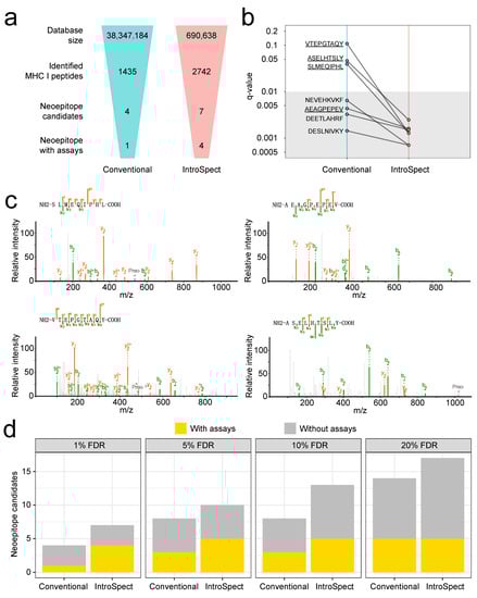 IntroSpect identified more neoepitopes than conventional search. (a) Flowcharts indicating key steps involved in neoepitope discovery. (b) Percolator q-values of neoepitopes identified by both methods are plotted. Underlined peptides have support in other studies. (c) Spectra of neoepitope candidates assigned by IntroSpect with assay support. Peaks represent b ions in green, y ions in orange and precursor ions in dark grey. (d) The numbers of neoepitopes identified by the two methods under different FDRs.