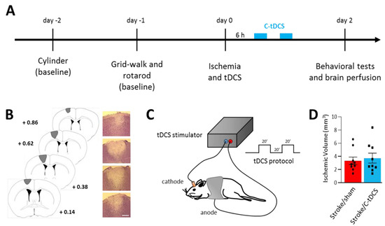 Two days before photothrombotic lesion induction, animals performed the cylinder test (baseline) and were trained to the rotarod. On the next day, mice were subjected to gridwalk and rotarod tests (baseline). According to the results obtained from the cylinder test, we determined the forelimb preference for each mouse and we performed the photothrombotic stroke induction or no-stroke (NS) procedure on the contralateral hemisphere. Immediately after, the electrode for tDCS was implanted. Two mice died after photothrombotic induction (one immediately after and one after 2 h); a post mortem analysis revealed no obvious cause of death such as hemorrhage, thus death probably resulted from ischemia (mortality rate of 5.5%). Six hours after photothrombosis, cathodal tDCS (C-tDCS) or no stimulation (sham) were applied. The animals (n = 34) were allowed to recover for two days, after which they were subjected to a post-ischemia cohort of motor tests in the following order: cylinder test, grid walking test, open field test and rotarod test (intervals of at least 2 h). Later, animals were intracardially perfused and their brain was extracted for histological analysis (Figure 1A–C).