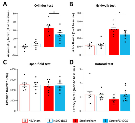 At 48 h after ischemia onset, the focal cortical lesion produced deficits in the forelimb preference (identified on the baseline cylinder test), as assessed on the cylinder and gridwalk tests (Figure 2A,B), with a significant main effect of stroke (F1,30 = 78.61, p < 0.0001 and F1,30 = 72.35, p < 0.0001, respectively). For both tests, the application of C-tDCS in the early phase after photothrombosis or in no stroke condition showed a significant stroke x stimulation interaction between baseline and post-stroke evaluation (F1,30 = 8.65, p = 0.0063 and F1,30 = 4.70, p = 0.0208, respectively). Post-hoc analysis with Tukey’s correction revealed that the C-tDCS resulted in a significant recovery of the affected forelimb function within the stroke group, in its voluntary use in the cylinder test (p = 0.028) and in the number of foot-faults in the gridwalk test (p = 0.046). No differences were observed between the no-stroke groups (p > 0.05).