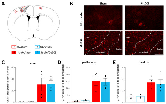 Astrocytes are known to play a key role in the preservation of brain homeostasis, and they are promptly activated following brain damage. After a brain injury such as a stroke, astrocytes are characterized by a strong proliferation and concomitant expression of the structural protein GFAP. We analyzed the area of GFAP expression in the core, perilesional and healthy regions of the four different conditions (Figure 3), and we found a significant increase in the stroke main effect in all of them (F1,12 = 0.032, p = 0.91; F1,12 = 0.11, p = 0.79; F1,12 = 0.40, p = 0.69, respectively). However, no differences in the stroke x stimulation interaction were observed (F1,12 = 65.16, p = 0.0005; F1,12 = 79.87, p < 0.0001; F1,12 = 70.13, p = 0.0002, respectively for the core, perilesional and healthy ROIs).