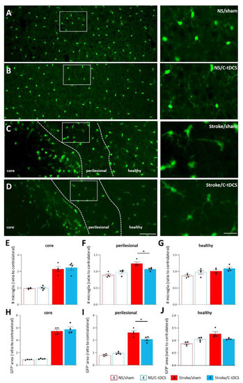 For this purpose, we induced a focal ischemic injury via photothrombosis in the M1 region of Cx3CR1GFP/+ mice and, six hours later, we applied an intermittent C-tDCS protocol. Behavioral, immunohistochemical and microglial morphological analysis showed that C-tDCS increased forelimb motor function and reduced microglia density in the perilesional area, evoking a more resting microglial and anti-inflammatory phenotype.