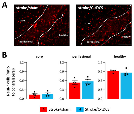 Effects of C-tDCS on NeuN+ cell loss after ischemia. (A) Representative images of NeuN+ cells in stroke mice with and without C-tDCS (bar = 100 μm) revealed no differences (B) in the core, perilesional and healthy areas. Data are presented as a mean ± SEM and statistical differences assessed by unpaired-t test.