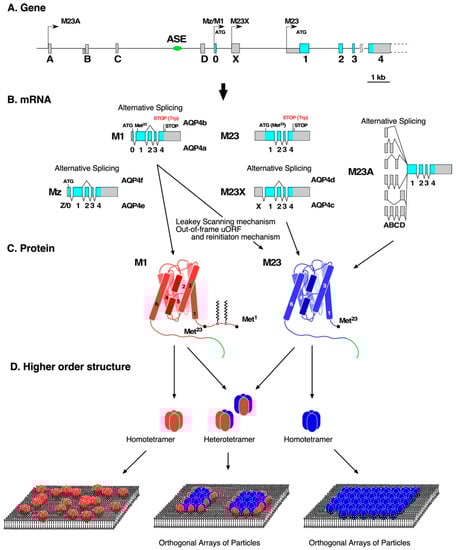 - Rossi, A.; Pisani, F.; Nicchia, G.P.; Svelto, M.; Frigeri, A. Evidences for a leaky scanning mechanism for the synthesis of the shorter M23 protein isoform of aquaporin-4: Implication in orthogonal array formation and neuromyelitis optica antibody interaction. J. Biol. Chem. 2010, 285, 4562–4569. [Google Scholar] [CrossRef] [PubMed] [Green Version]