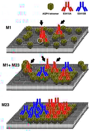 - Rossi, A.; Ratelade, J.; Papadopoulos, M.C.; Bennett, J.L.; Verkman, A.S. Neuromyelitis optica IgG does not alter aquaporin-4 water permeability, plasma membrane M1/M23 isoform content, or supramolecular assembly. Glia 2012, 60, 2027–2039. [Google Scholar] [CrossRef] [PubMed] [Green Version]