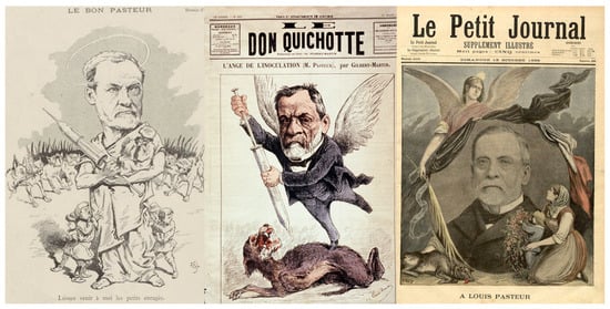Figure 1. Left: Pasteur in the French Press seen as a lay saint (Le Courrier Français, 4 April 1886); center: as an angel fighting rabies (Le Don Quichotte, 13 March 1886); right: as a revered icon after his death (Le Petit Journal, 13 October 1895). (© Institut Pasteur, Musée Pasteur).