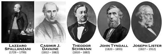 Figure 2. The main predecessors recognized by Louis Pasteur (Spallanzani, Davaine, and Schwann) and his main supporters (Tyndall and Lister) (© Institut Pasteur, Musée Pasteur; © Wikipedia; © Collection of Pauls Stradiņš, Museum of History of Medicine, Riga, Latvia).