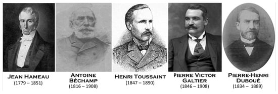 Figure 3. Louis Pasteur faced numerous precursors, opponents, and competitors. Some were wrong, but a few, particularly Hameau, Béchamp, Toussaint, Galtier, and Duboué, were right despite being unknown or poorly recognized by Louis Pasteur (© Wikipedia/© https://gw.geneanet.org accessed on 19 March 2022).