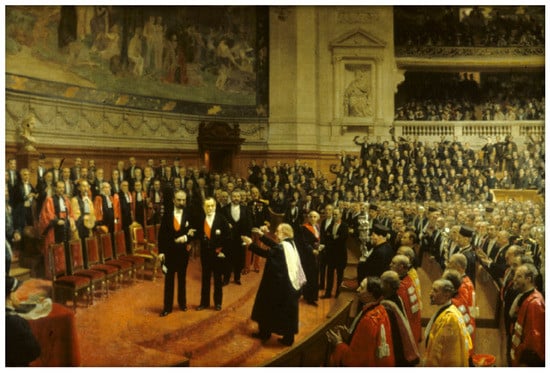 On 27 December 1892, for Pasteur’s 70th birthday, the international scientific community celebrated Pasteur’s “jubilee”. The reception took place in the large amphitheater of the Sorbonne. In a painting painted ten years later, the artist Jean-André Rixens recalled this celebration displaying Lister precisely in the middle of the painting, shown going up a few steps to congratulate Pasteur (Figure 4). In 1874, Just Lucas-Champonnière (1843–1913), after travelling to Scotland, introduced Lister’s antiseptic approach in France [60]. Similarly, Lewis Atterbury Stimson (1844–1917) attended a presentation of Pasteur in 1875 at the Academy of Medicine on spontaneous generation and the capacity of lime hyposulphite to instantly destroys all germs. Back in New York, in January 1876, he successfully completed the first amputation in the USA under completely aseptic conditions [61].