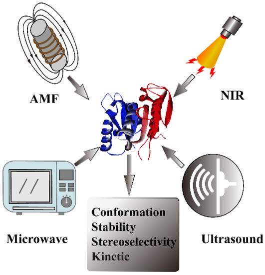 To overcome these disadvantages of conventional methods, many studies have paid close attention to exploring efficient activation means to achieve precise and rapid control of enzyme activity. Therefore, real-time activation includes near-infrared (NIR), alternating magnetic field (AMF), microwave, and ultrasound irradiation, which can make it available to remotely and spatiotemporally improve enzyme activity and maximize their biological function (Figure 1). Due to their sustainability, low invasiveness, and easy tunability, these technologies are highly appropriate for real-time controlling of enzymatic conformation, activity, and other properties and have emerged as an effective toolkit in various fields, such as cancer therapy, the food industry, and environmental engineering [10,11,12,13]. Furthermore, real-time activation strategies can also intensively improve the reaction rate, shorten the reaction time, and reduce the mass transfer resistance. According to the different mechanisms of real-time strategies, nanomaterials such as plasmonic nanoparticles that are responsive to NIR and magnetic nanoparticles stimulated by AMF have been widely applied for enzyme immobilization to transfer energy to control enzyme activity. Microwaves, ultrasound, and AMF can directly influence enzymatic behavior only for certain enzymes without the assistance of nanomaterials. However, few reviews have been published in recent years systematically elucidating and summarizing four different real-time activation strategies of enzymes. Thus, this review provides a deep understanding and accessible discussion associated with the mechanism of real-time activation of enzyme activity. Additionally, it is involved in activating factors influencing enzyme catalytic performance as well as their prospective applications.
