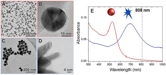 (A,B) TEM images of AuNSp@CALB; (C,D) TEM images of AuNSt@CALB; (E) UV−vis spectra of AuNSp@CALB (red line) and AuNSt@CALB (blue line). Reprinted with permission from de Barros et al., American Chemical Society [14].